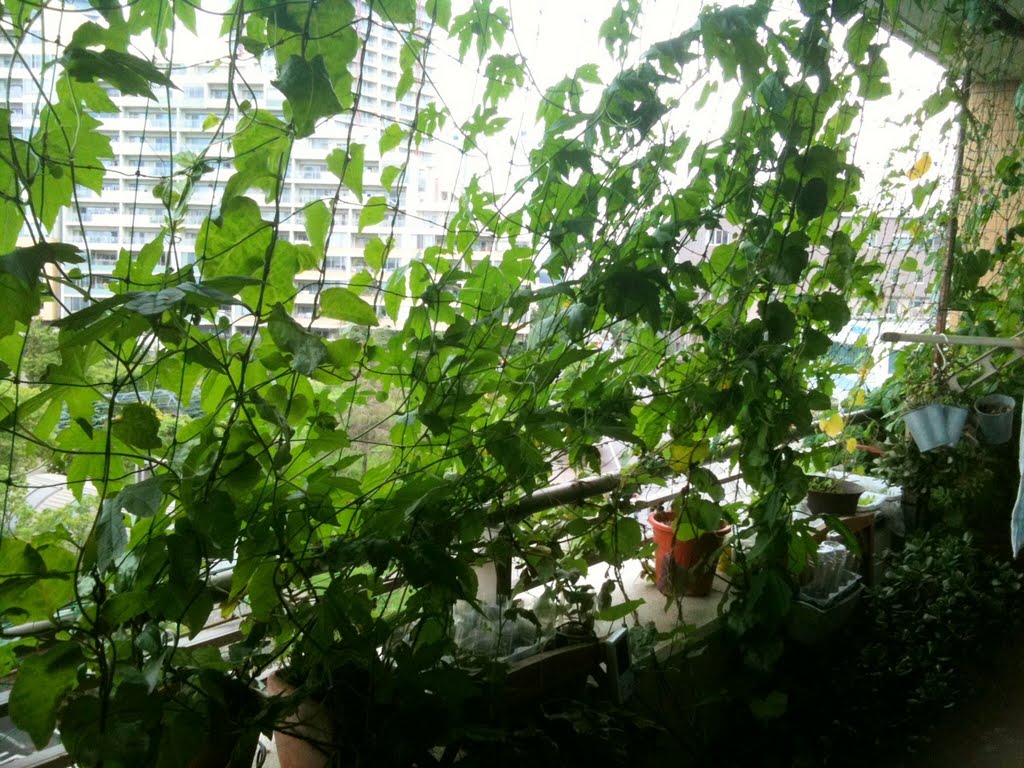最初にブログを書いた7月2日から、本日までの「緑のカーテン」の写真です。こうしてみると、今はもう人生の黄昏時という感じですね。すっかりスカスカになり、葉は黄ばみ、枯れ落ちるものも少なからずです。昨日のブログにも書きましたが、直射日光を遮る効果が薄まり、かえって猛暑の頃よりも「カーテン」内の温度は高まっています。