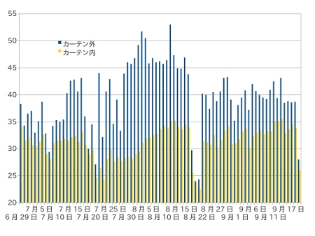 基本的には連動していた両観測地点の観測値が、8月末ごろになって、急に乖離するのが読み取れると思います。それまではわずかに「カーテン」内の温度の方が低くなる傾向だったのですが、それ以降は逆に、「カーテン」内の温度が気温を上回るケースが増えています。